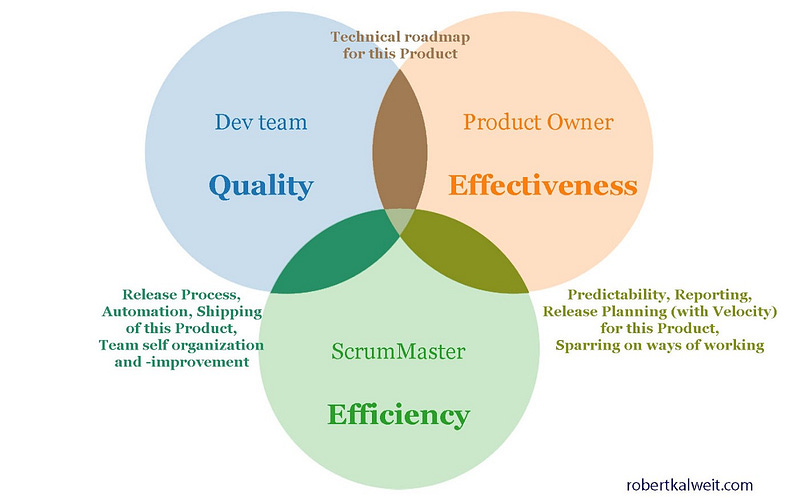 These three roles are all equally important and form a three-way Venn diagram (the one below). Scrum Diagram